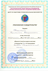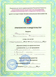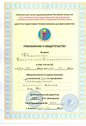 Сертификат специалиста Национального научного центра развития здравоохранения имени Салидат Каирбековой №9349 методологии проведения экспертиз образовательных программ дополнительного образования в сфере оздоровительной и лечебной деятельности.