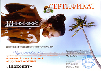Компания «Шоконат» является ведущим производителем натуральной ШОКОЛАДНОЙ, ВИННОЙ, МЕДОВОЙ и ЗОЛОТОЙ косметики для салонных и домашних косметических процедур с 2007 года. В ее состав входят только натуральные, экологически безопасные ингредиенты. Косметика «Шоконат» не содержит искусственных красителей и консервантов и для ее разработки используется какао-тертое высшего качества (производство Кот-Д'Ивуар, 55%) с добавлением различных экстрактов.
