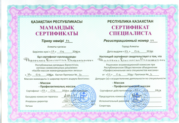 Cертификат специалиста №KZ86VBM00694368 для осуществления медицинской деятельности и допуска к клинической практике Министерства Здравоохранения Республики Казахстан.